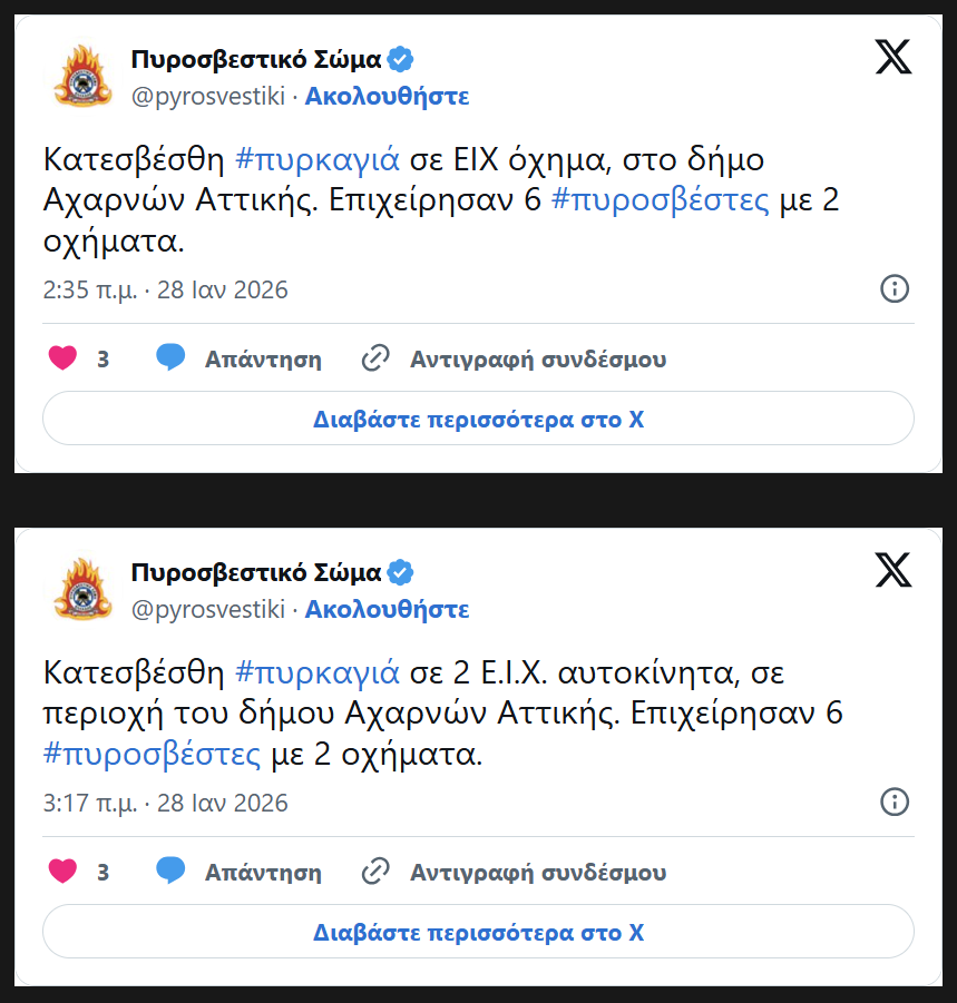 Συναγερμός σήμανε τα ξημερώματα της Τετάρτης (28/1) στην Πυροσβεστική Υπηρεσία για φωτιά σε τρία Ε.Ι.Χ αυτοκίνητα στο δήμο Αχαρνών Αττικής.