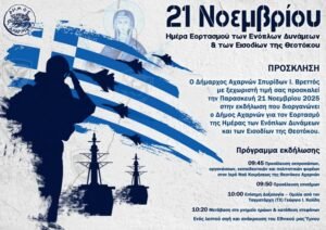 Ο Δήμος Αχαρνών τιμά την Ημέρα Εορτασμού των Ενόπλων Δυνάμεων & των Εισοδίων της Θεοτόκου, την Παρασκευή 21 Νοεμβρίου.Πρόγραμμα εκδήλωσης09:45