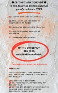 Η Ένωση Γονέων και Κηδεμόνων Δήμου Αχαρνών καλεί όλους τους Συλλόγους Γονέων και τους γονείς να δώσουν δυναμικό παρών την