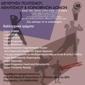 Ο Δήμος Αχαρνών και για τη χρονιά 2025-2026 θα λειτουργήσει Καλλιτεχνικά Τμήματα, προσφέροντας πλούσιες και δημιουργικές δράσεις μέσα από τη