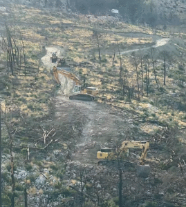 Οι μπουλντόζες καταστρέφουν το μονοπάτι κατεβαίνοντας προς το ρέμα. Πίσω και ψηλότερα διακρίνεται ο Άι Γιώργης. Μπουλντόζες έχουν μπει στο