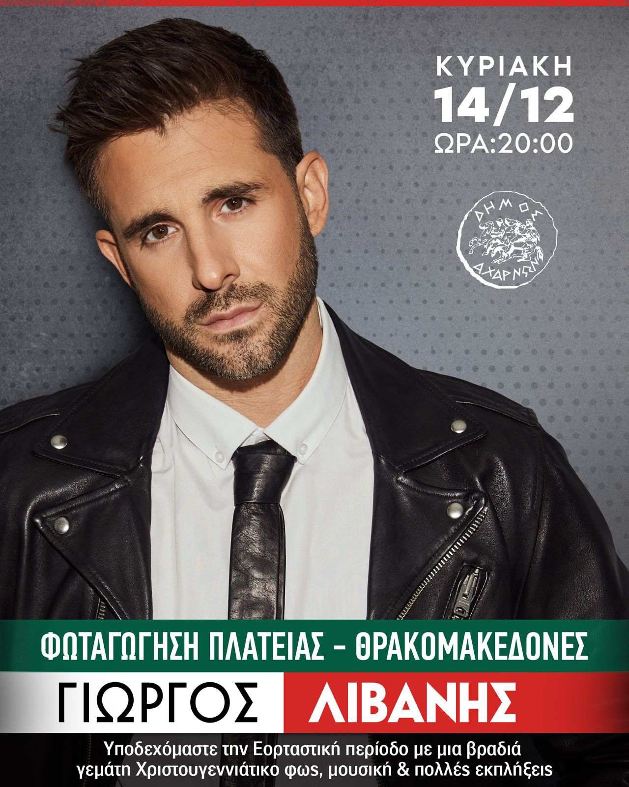 Μια μεγάλη μουσική βραδιά προγραμματίζει ο Δήμος Αχαρνών και για τους Θρακομακεδόνες. Το βράδυ της Κυριακής (14/12) η πλατεία φωτίζεται με μουσικές και εκπλήξεις. Μια μεγάλη γιορτή που θα ολοκληρωθεί με τη συναυλία του Γιώργου Λιβάνη.