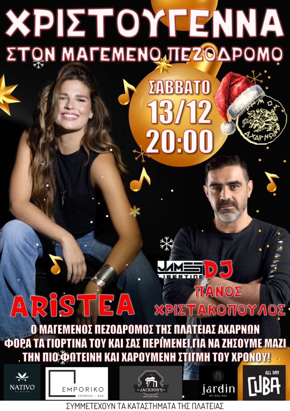 Το βράδυ του Σαββάτου (13/12) την τιμητική της έχει η κεντρική μας πλατεία. Άρωμα Χριστουγέννων στον «Μαγεμένο Πεζόδρομο» από τις 7 το απόγευμα. Μία ώρα αργότερα ξεκινάει το πάρτι με την Αριστέα και τον Dj Πάνο Χριστακόπουλο. Με τη συμμετοχή καταστημάτων της πλατείας.