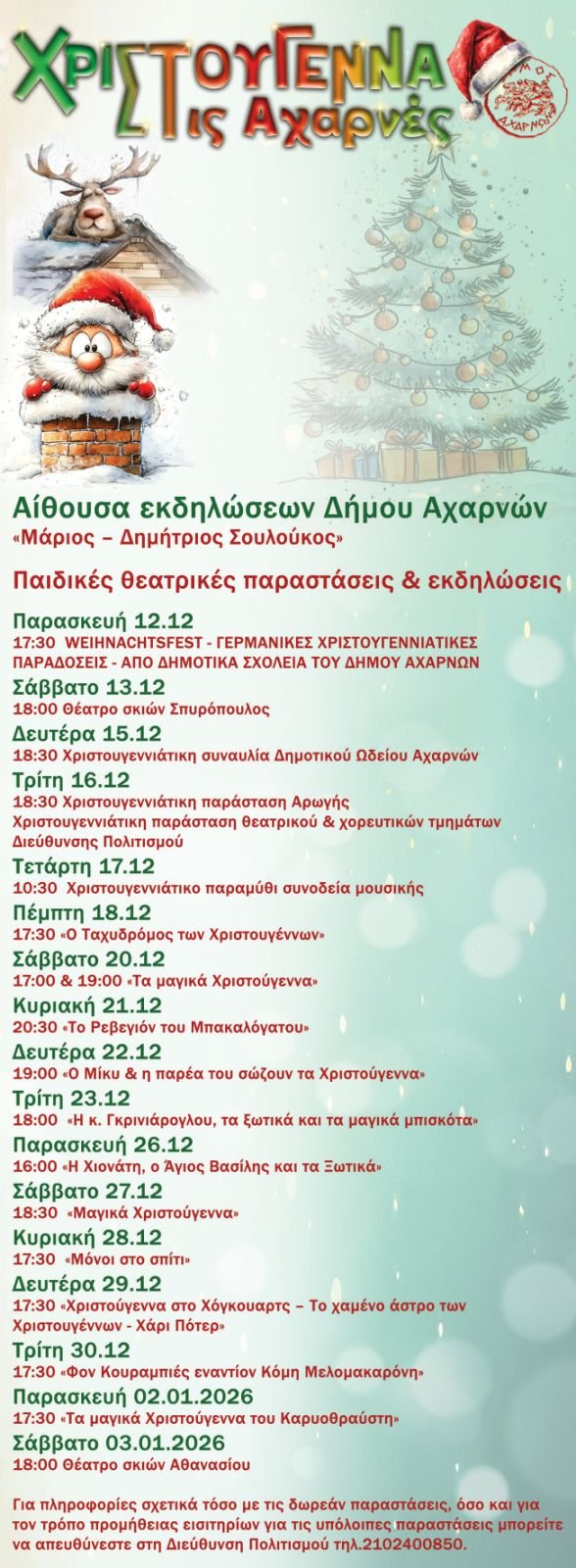 Οι μέρες των γιορτών όμως θα είναι γεμάτες για όλους τους Αχαρνείς. Ο Δήμος και η Διεύθυνση Πολιτισμού και Αθλητισμού έχει δημιουργήσει ένα πλούσιο πρόγραμμα. Από την Παρασκευή (12/12) στην αίθουσα εκδηλώσεων «Μάριος – Δημήτριος Σουλούκος» του Δημαρχείου Αχαρνών και σχεδόν καθημερινά θα υπάρχουν θεατρικές και μουσικές παιδικές παραστάσεις, πολλές εκ των οποίων θα είναι δωρεάν. Παράλληλα στον εξωτερικό χώρο της πλατείας Δημαρχείου θα υπάρχουν δράσεις για τα παιδιά κάθε απόγευμα μετά τις 5, ενώ τα Σαββατοκύριακα και τις αργίες θα αρχίζουν από τις 11 το πρωί.