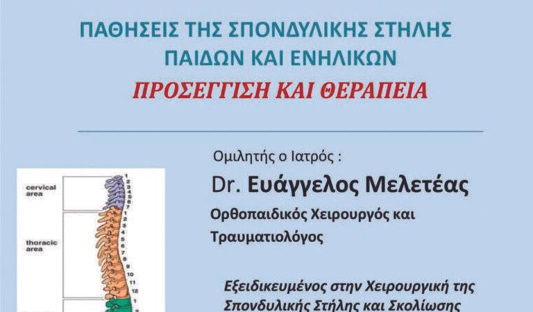 Η εκδήλωση απευθύνεται σε γονείς, εκπαιδευτικούς, επαγγελματίες υγείας αλλά και σε κάθε πολίτη που ενδιαφέρεται να ενημερωθεί για τα σύγχρονα προβλήματα και τις μεθόδους αντιμετώπισης που αφορούν τη σπονδυλική στήλη. Στη διάρκεια της διάλεξης θα παρουσιαστούν συχνές παιδικές και ενήλικες παθήσεις, τρόποι έγκαιρης διάγνωσης, προληπτικές πρακτικές, καθώς και νεότερα δεδομένα στη θεραπευτική αντιμετώπιση.