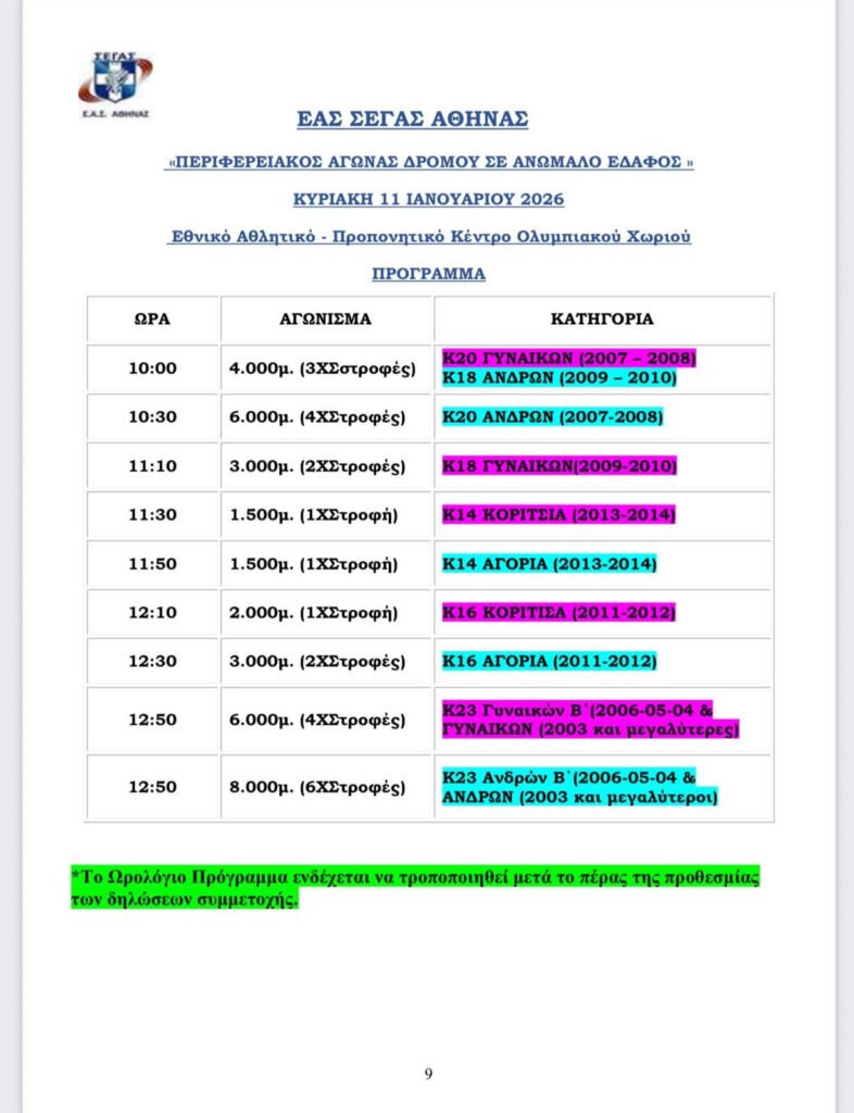 Μία ακόμη σημαντική αθλητική διοργάνωση φιλοξενεί ο Δήμος Αχαρνών την Κυριακή 11 Ιανουαρίου 2026, ενισχύοντας τη θέση του στον αθλητικό χάρτη της Αττικής. Στο Εθνικό Αθλητικό Προπονητικό Κέντρο του Ολυμπιακού Χωριού θα διεξαχθεί ο Περιφερειακός Αγώνας Δρόμου σε ανώμαλο έδαφος και δημόσια οδό για την Αθήνα.