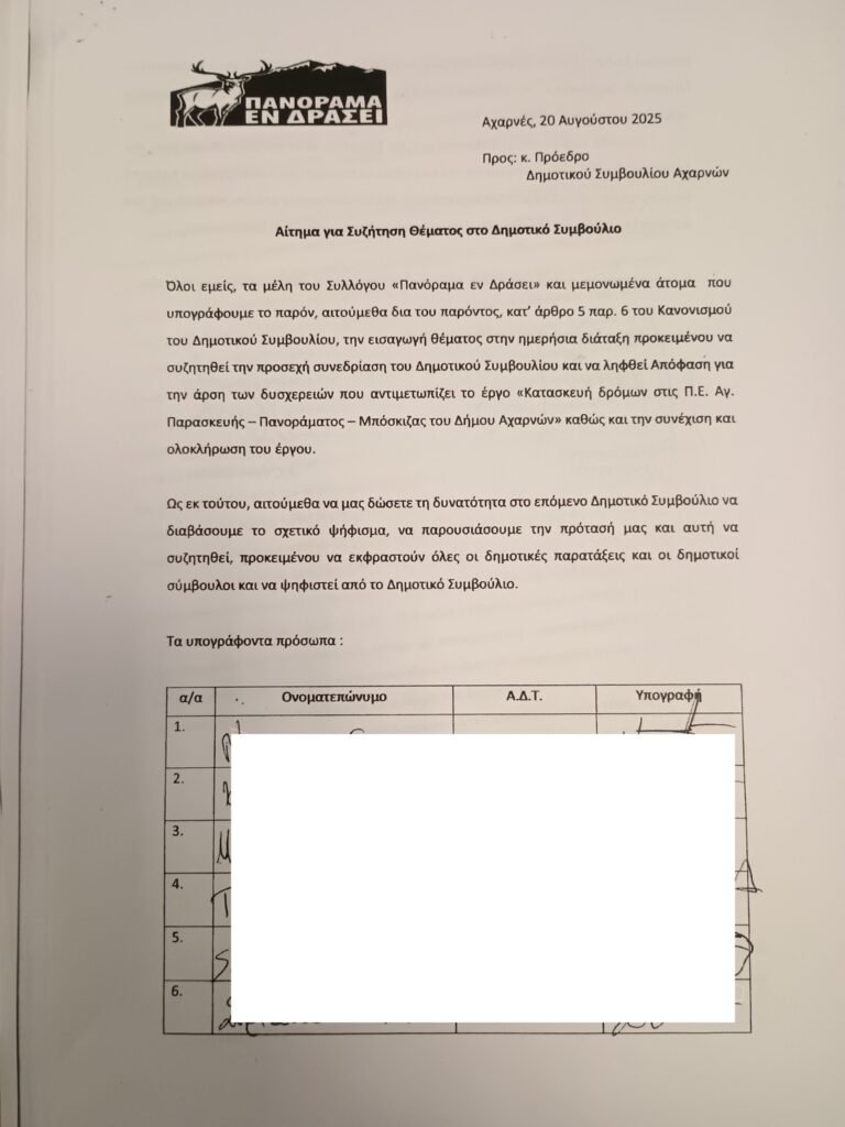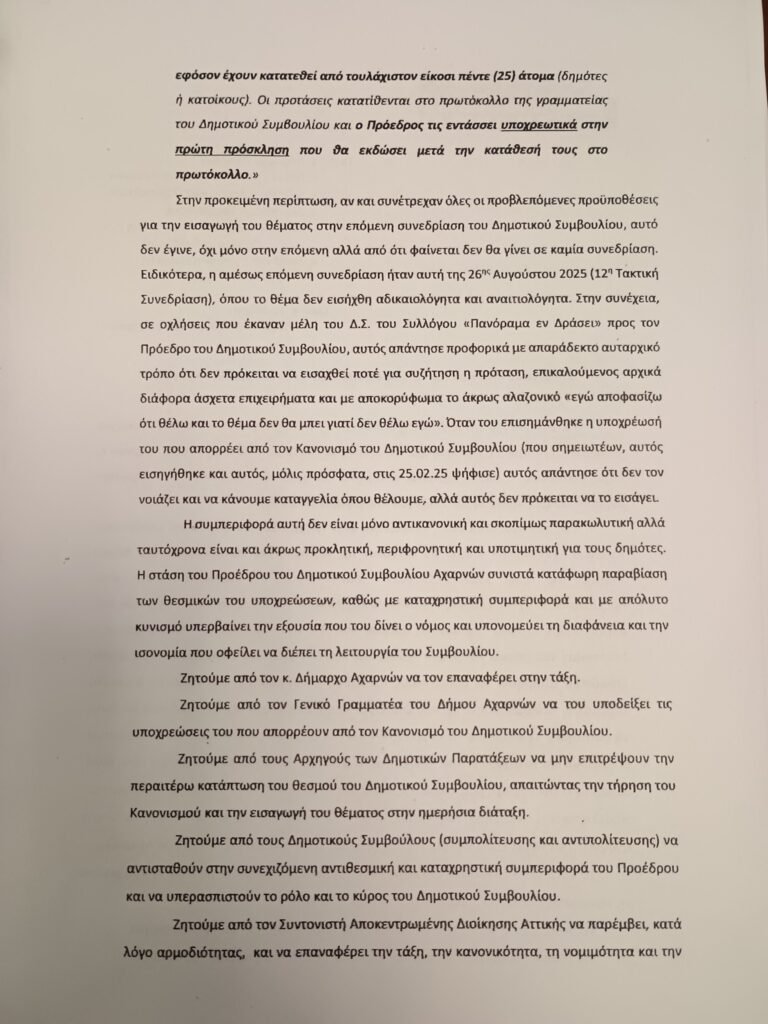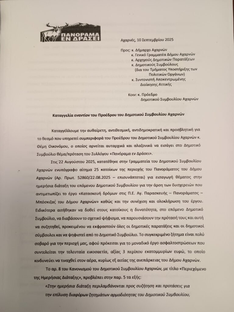Βρισκόμαστε στη δύσκολη θέση να καταγγείλουμε τον Πρόεδρο του Δημοτικού Συμβουλίου Αχαρνών γιατί κυνικά και αντικανονικά αρνείται να εισάγει στο Δημοτικό Συμβούλιο θέμα για τη συνέχιση του έργου των ασφαλτοστρώσεων που κινδυνεύει να τιναχθεί στον αέρα, εξ αιτίας της ολιγωρίας του Δήμου και της παραίτησης του εργολάβου.