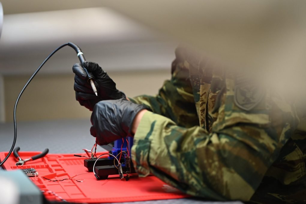 Εδώ έχουμε ένα εργοστάσιο παραγωγής μη επανδρωμένων αεροχημάτων, drones, κατηγορίας Ι και First Person View (FPV), αλλά και μεγαλύτερων drones κατηγορίας Ι, καθώς επίσης εδώ έχουμε αναπτύξει δύο πρωτότυπους φορητούς σταθμούς παραγωγής drones, οι οποίοι θα εμφανιστούν για πρώτη φορά στην παρέλαση της 28ης Οκτωβρίου στη Θεσσαλονίκη. Και είναι κατασκευασμένοι για να ακολουθούν τις μεγάλες μονάδες μας. Δηλαδή, να μπορούν να παράγουν FPV drones επί του πεδίου.