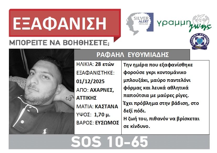 Ο Ραφαήλ Ευθυμιάδης, 28 ετών, εξαφανίστηκε από το σπίτι του, στις Αχαρνές Αττικής, το πρωί της 01/12/25, όταν έφυγε για να πάει στην εργασία του και έκτοτε αγνοείται.