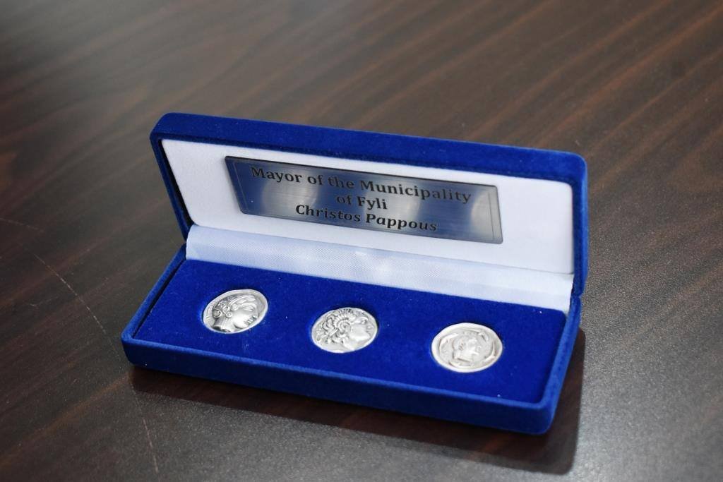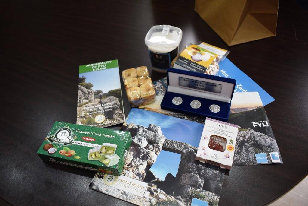 Ξεχωριστά συμβολικά δώρα εξάλλου πρόσφερε σε όλα τα στελέχη της Αποστολής ο Δήμαρχος, με την παράκληση να μεταφέρουν τους θερμούς του χαιρετισμούς κι ένα από αυτά και στον Δήμαρχο Βρυξελλών κ. Philippe Close (Φιλίπ Κλοζ). Η οικολογική τσάντα με τα αναμνηστικά δώρα περιλάμβανε, ένα κουτί με αντίγραφα παλαιών νομισμάτων που έχουν βρεθεί στην περιοχή, ξεχωριστά ελληνικά παραδοσιακά εδέσματα και έντυπες εκδόσεις για την ιστορία και την λαογραφία του Δήμου Φυλής.