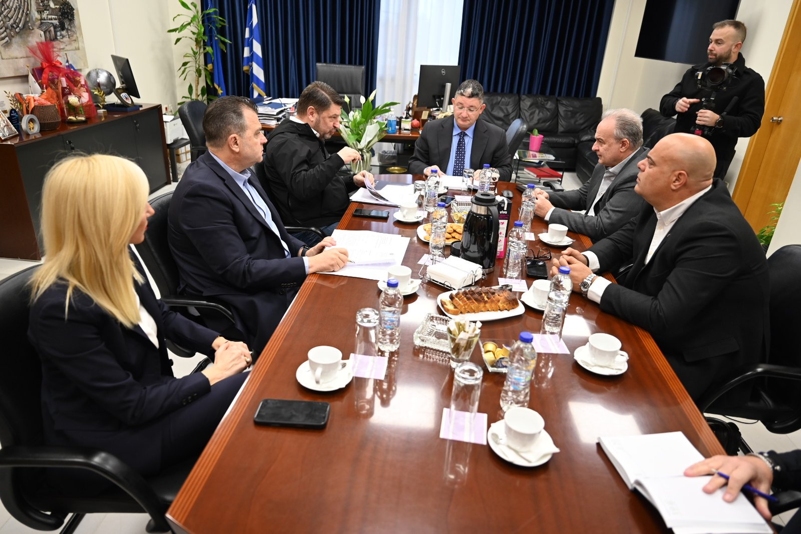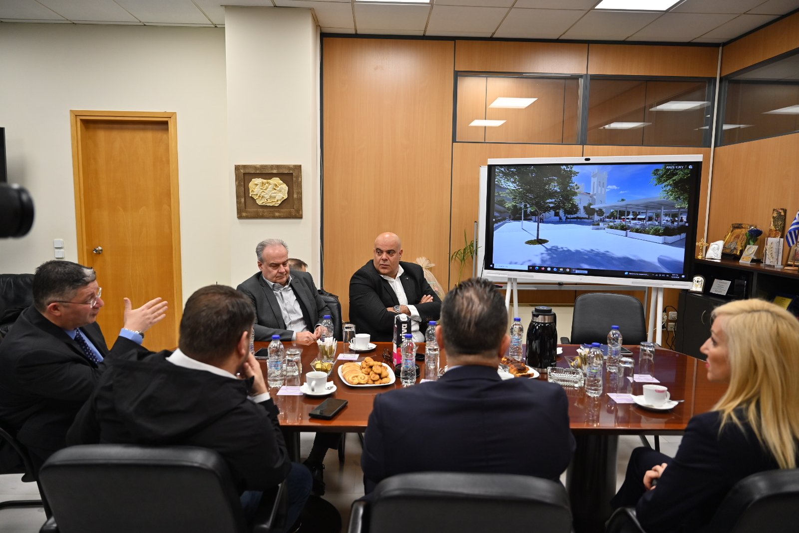 Στη σύσκεψη που πραγματοποιήθηκε στο δημαρχιακό μέγαρο τον κ. Σπύρο Βρεττό πλαισίωναν οι Αντιδήμαρχοι Χρύσανθος Κόνταρης (Προγραμματισμού και Χρηματοδοτούμενων Έργων) και Νίκος Δαμάσκος (Τεχνικών υπηρεσιών και έργων υποδομών), ο Πρόεδρος του Δημοτικού Συμβουλίου Θέμης Οικονόμου και ο Γενικός Γραμματέας του Δήμου, Γιάννης Δημητρακόπουλος.