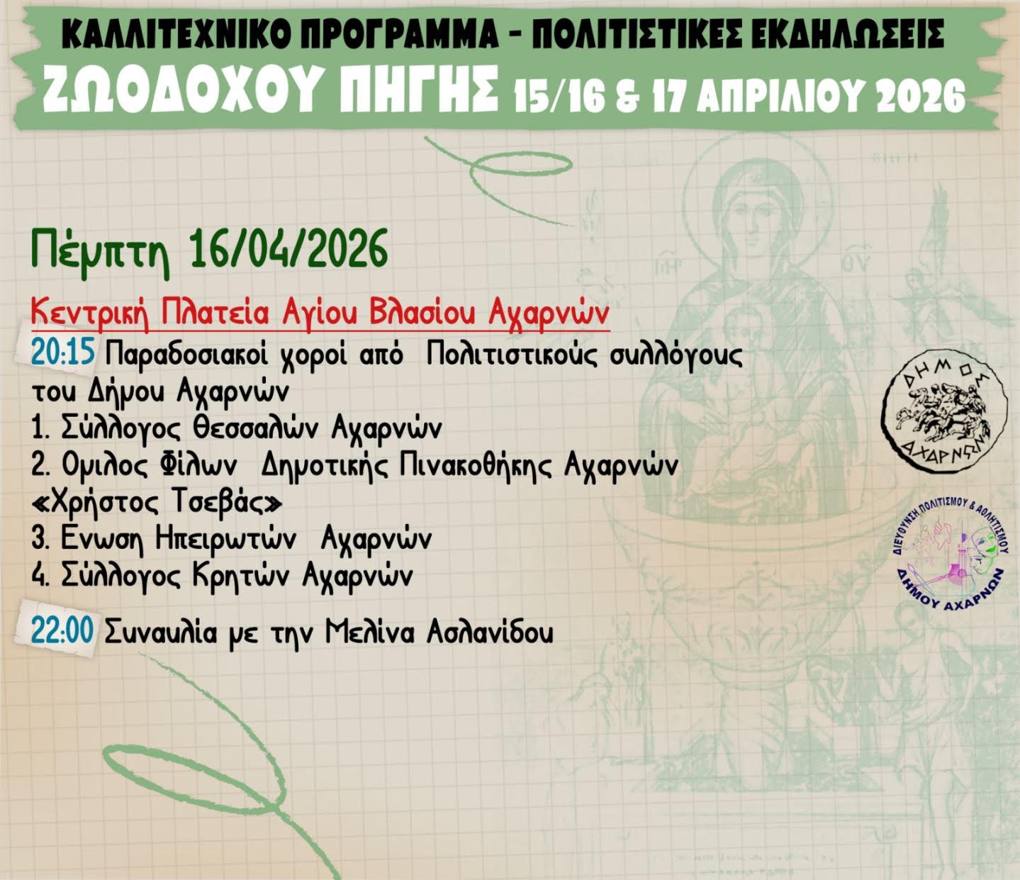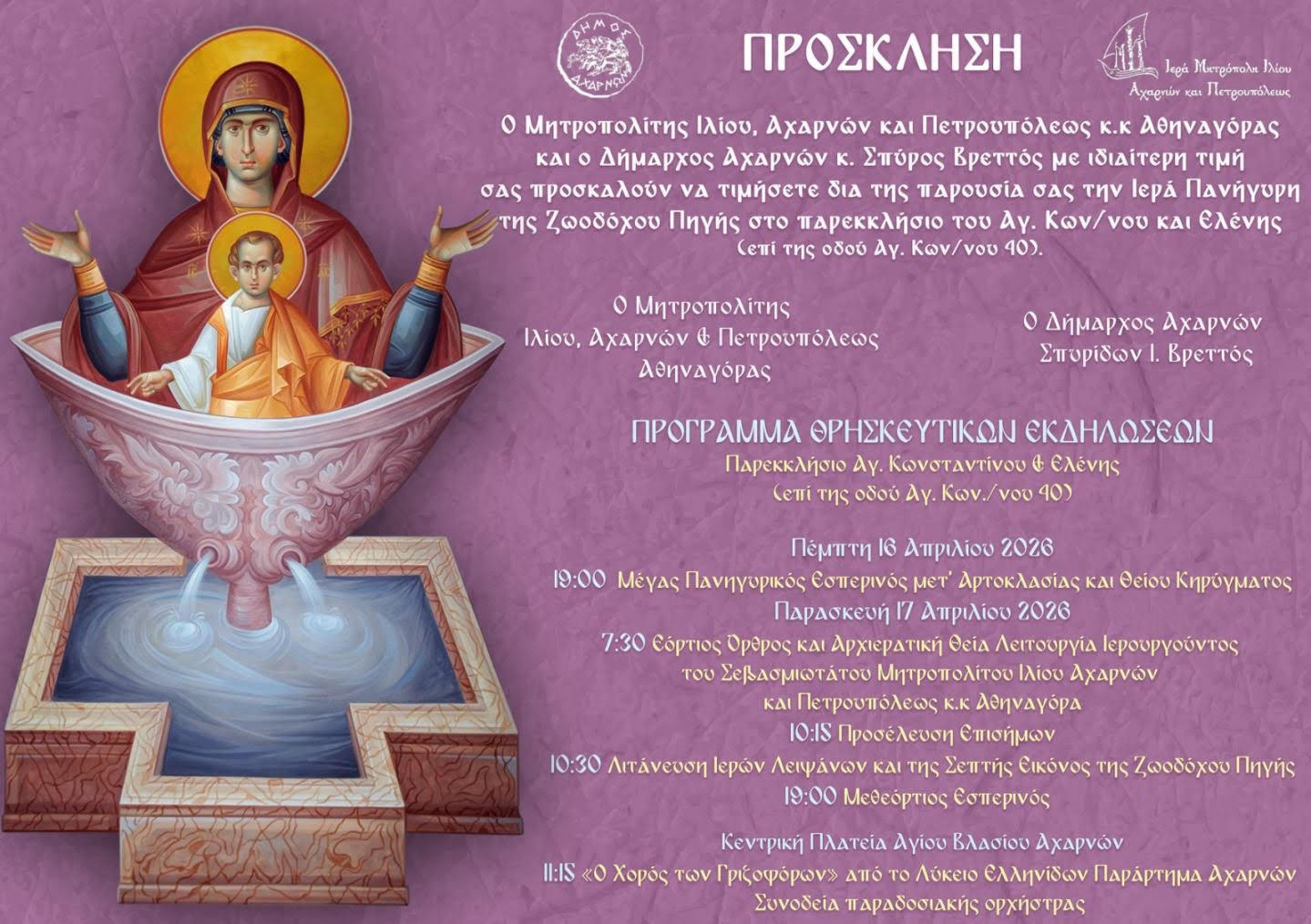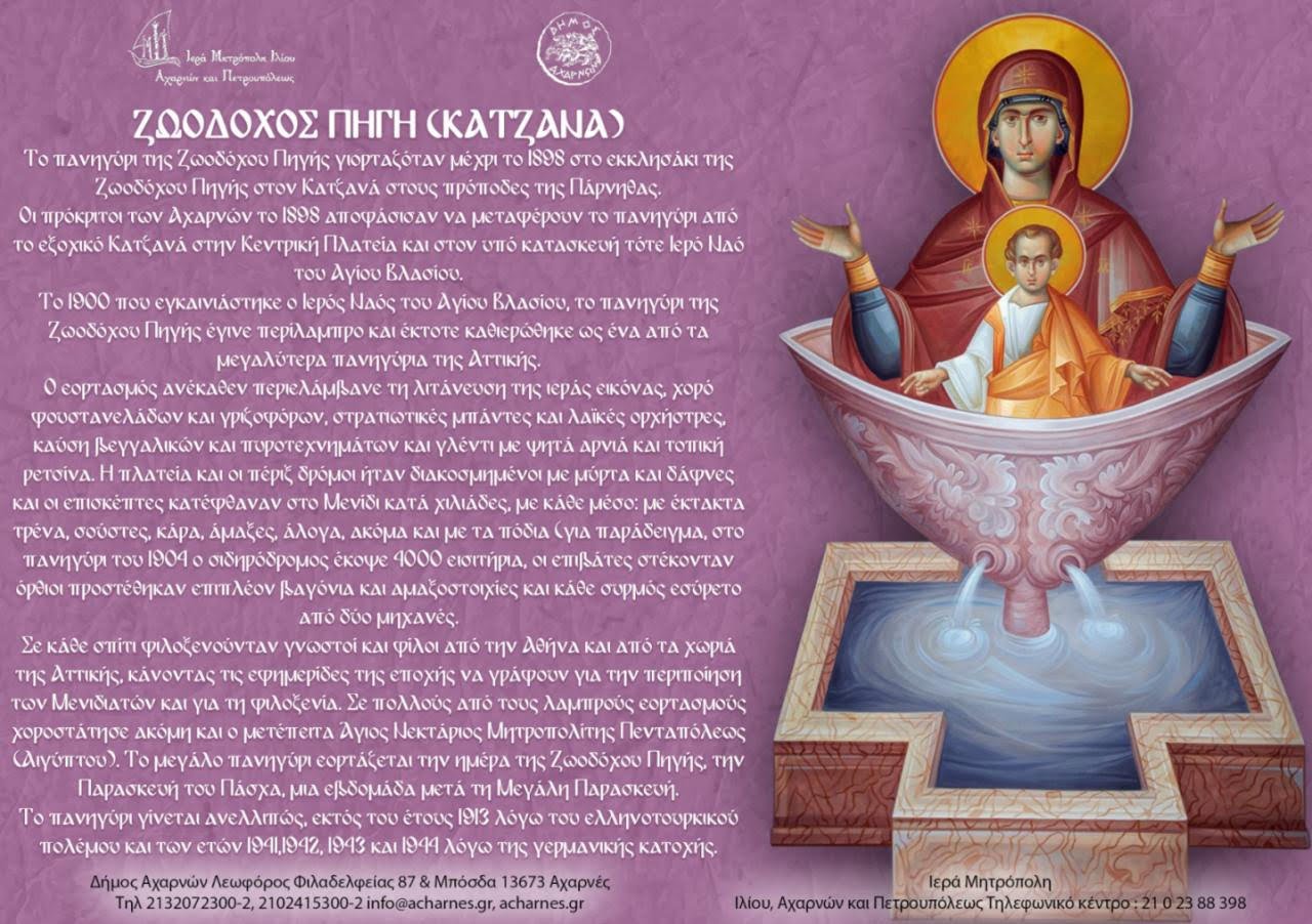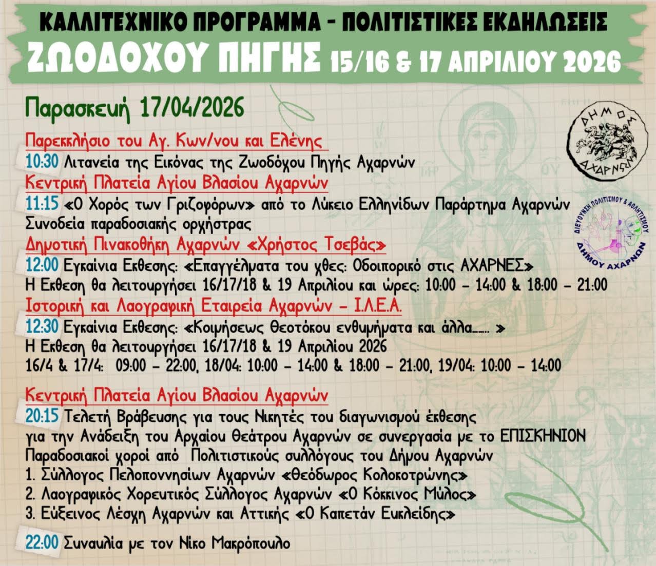 Και φέτος ο εορτασμός θα είναι τριήμερος από τις 15 έως τις 17 Απριλίου. Οι θρησκευτικές εκδηλώσεις θα πραγματοποιηθούν στο Παρεκκλήσιο Αγ. Κωνσταντίνου και Ελένης και θα κορυφωθούν με τη Λιτάνευση των Ιερών Λειψάνων και της Σεπτής Εικόνας την Παρασκευή 17 Απριλίου. Για τρεις μέρες η κεντρική πλατεία Αχαρνών θα φιλοξενήσει σειρά εκδηλώσεων, τις παρουσιάσεις των πολιτιστικών και εθνοτοπικών συλλόγων, ενώ κάθε βραδιά θα κλείνει με μια μεγάλη συναυλία.