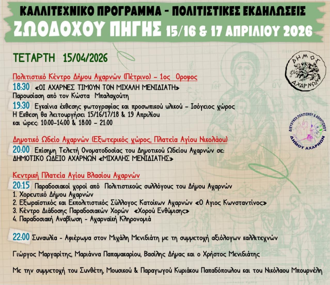 Το καλλιτεχνικό πρόγραμμα της φετινής χρονιάς θα έχει ιδιαίτερη χροιά, καθώς στο επίκεντρο θα βρεθεί η μνήμη και η τιμή για έναν μεγάλο λαϊκό τραγουδιστή, τον Μιχάλη Μενιδιάτη. Έναν σπουδαίο λαϊκό βάρδο, οποίος είναι στην κοινή συνείδηση συνδεδεμένος με τις Αχαρνές. Έτσι το άνοιγμα των φετινών εκδηλώσεων την Τετάρτη 15/04 ο Δήμος Αχαρνών διοργανώνει μια βραδιά αφιερωμένη στον Μιχάλη Μενιδιάτη, η οποία θα ξεκινήσει με έκθεση που θα πραγματοποιηθεί στο Πέτρινο και με την επιμέλεια του διακεκριμένου ερευνητή του λαϊκού τραγουδιού Κώστα Μπαλαχούτη, μουσικές εκπλήξεις και θα κλείσει με μια μεγάλη συναυλία στην κεντρική πλατεία.
