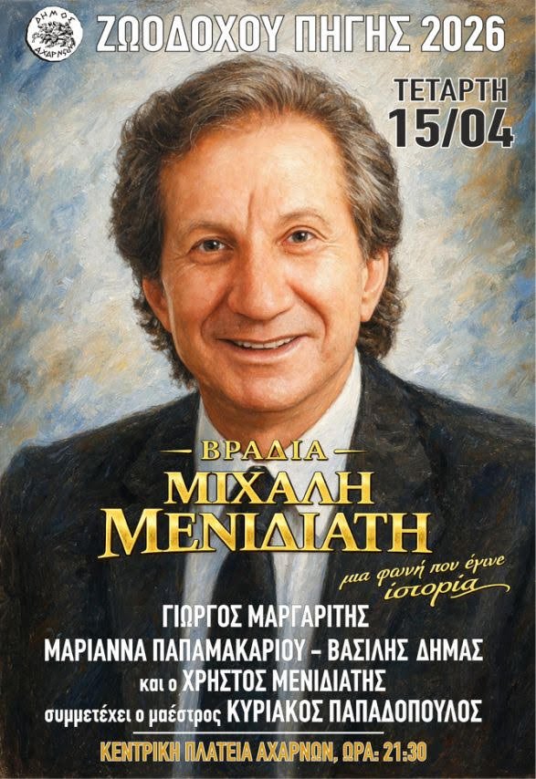 - Οι Αχαρνές τιμούν τον Μιχάλη Μενιδιάτη (Τετάρτη 15/4, Πέτρινο) – Επίσημη ονοματοδοσία Δημοτικού Ωδείου
