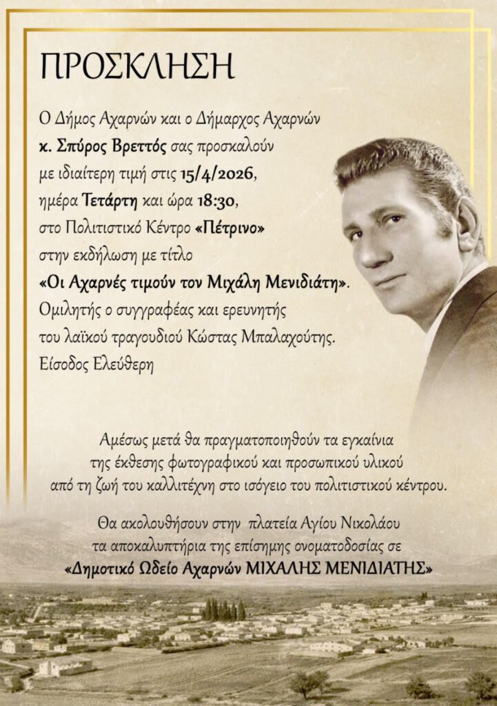 Μια ιδιαίτερα σημαντική πολιτιστική εκδήλωση πρόκειται να πραγματοποιηθεί την Τετάρτη 15 Απριλίου 2026 στις 18:30, στο Πολιτιστικό Κέντρο «Πέτρινο», με πρωτοβουλία του Δήμου Αχαρνών και του Δημάρχου Σπύρου Βρεττού. Η εκδήλωση, με τίτλο «Οι Αχαρνές τιμούν τον Μιχάλη Μενιδιάτη», αποτελεί έναν ελάχιστο φόρο τιμής σε έναν από τους σημαντικότερους εκπροσώπους του λαϊκού τραγουδιού.