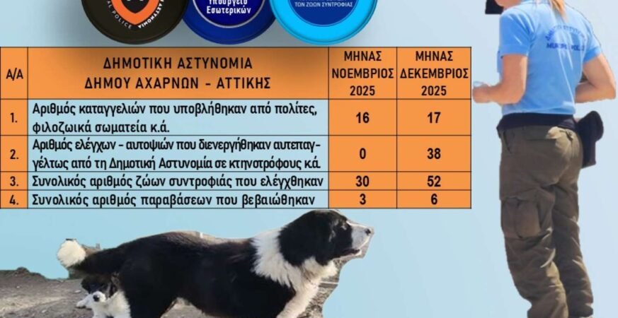 Η Δημοτική Αστυνομία του Δήμου Αχαρνών με δυναμικό 10 ένστολους Δημοτικούς Αστυνομικούς και Εντεταλμένο Σύμβουλο τον Χρήστο Γκίκα στο πλαίσιο των αρμοδιοτήτων της κατά το δίμηνο Νοέμβριος – Δεκέμβριος 2025 έλαβε συνολικά 33 καταγγελίες πολιτών που αφορούσαν συνολικά 82 ζώα συντροφιάς. Πραγματοποίησε για τον σκοπό αυτό 83 αυτοψίες και επέβαλε έξι βεβαιώσεις παράβασης για τη μη τήρηση της νομοθεσίας.