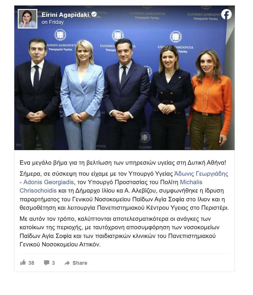 Σήμερα, σε σύσκεψη που είχαμε με τον υπουργό Υγείας Άδωνι Γεωργιάδη, τον υπουργό Προστασίας του Πολίτη Μιχάλη Χρυσοχοΐδη και τη δήμαρχο Ιλίου κα Α. Αλεβίζου, συμφωνήθηκε η ίδρυση παραρτήματος του Γενικού Νοσοκομείου Παίδων “Αγία Σοφία” στο Ιλιον και η θεσμοθέτηση και λειτουργία Πανεπιστημιακού Κέντρου Υγειας στο Περιστέρι.