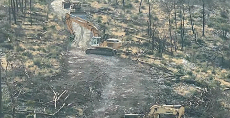 Οι μπουλντόζες καταστρέφουν το μονοπάτι κατεβαίνοντας προς το ρέμα. Πίσω και ψηλότερα διακρίνεται ο Άι Γιώργης.