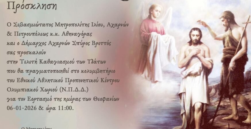 Με κάθε επισημότητα θα εορταστεί η μεγάλη δεσποτική εορτή των Θεοφανίων στον Δήμο Αχαρνών. Ο Σεβασμιώτατος Μητροπολίτης Ιλίου, Αχαρνών και Πετρουπόλεως κ.κ. Αθηναγόρας και ο Δήμαρχος Αχαρνών, Σπύρος Βρεττός, προσκαλούν το κοινό στην Τελετή Καθαγιασμού των Υδάτων.